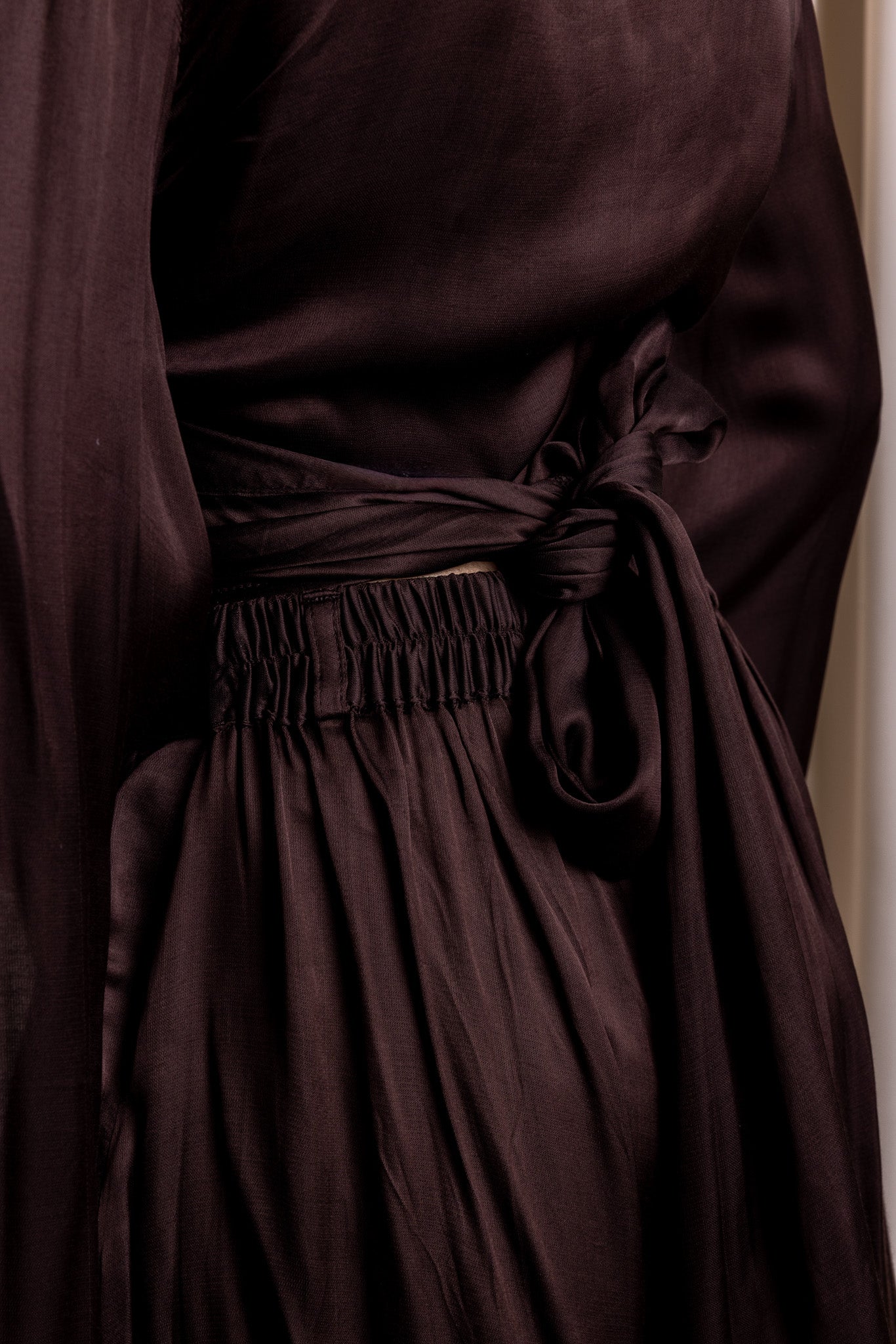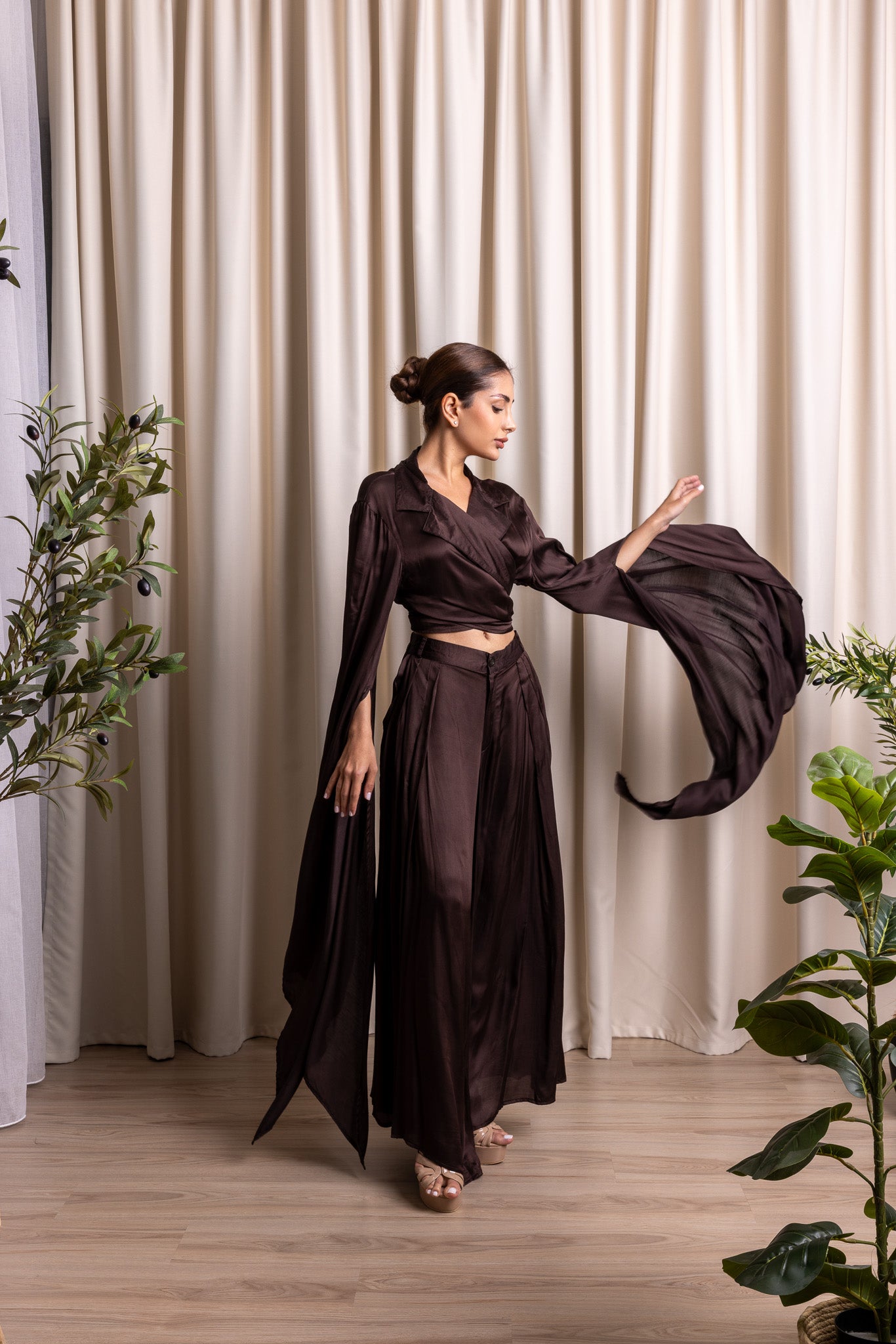 Meet our best-seller , the ATVĀH wrap blazer. A silhouette designed to flatter every shape, this slightly cropped blazer wraps effortlessly around the waist, allowing you to style it your way. Featuring elongated, dramatic sleeves and crafted from our signature plant-based modal satin, It blends comfort and quiet luxury.